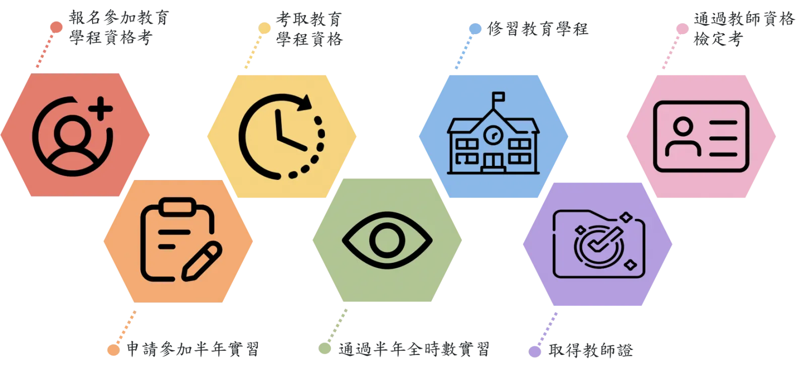 - 師培歷程:報名參加教育學程資格考→考取教育學程資格→修習教育學程→通過教師資格檢定考→申請參加半年實習→通過半年全時數實習→取得教師證