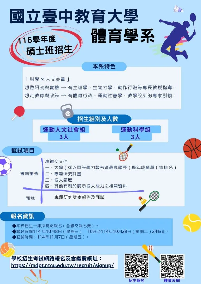 2、115學年度研究所甄試入學招生考試採網路報名,報名時間自114年10月7日(星期二)10時至114年10月28日(星期二)24時(報名網址https://mdpt.ntcu.edu.tw/recruit/signup/login_sign.php,逾期不受理)。3、面試日期為114年11月7日(星期五)上午