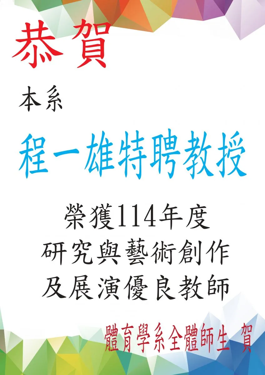 恭賀!本系程一雄老師榮獲114年度研究與藝術創意及展演優良教師獎勵。