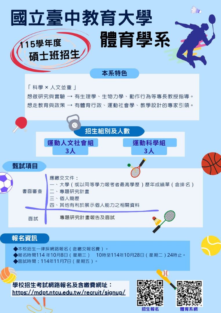 2、115學年度研究所甄試入學招生考試採網路報名,報名時間自114年10月7日(星期二)10時至114年10月28日(星期二)24時(報名網址https://mdpt.ntcu.edu.tw/recruit/signup/,逾期不受理)。3、面試日期為114年11月7日(星期五)上午