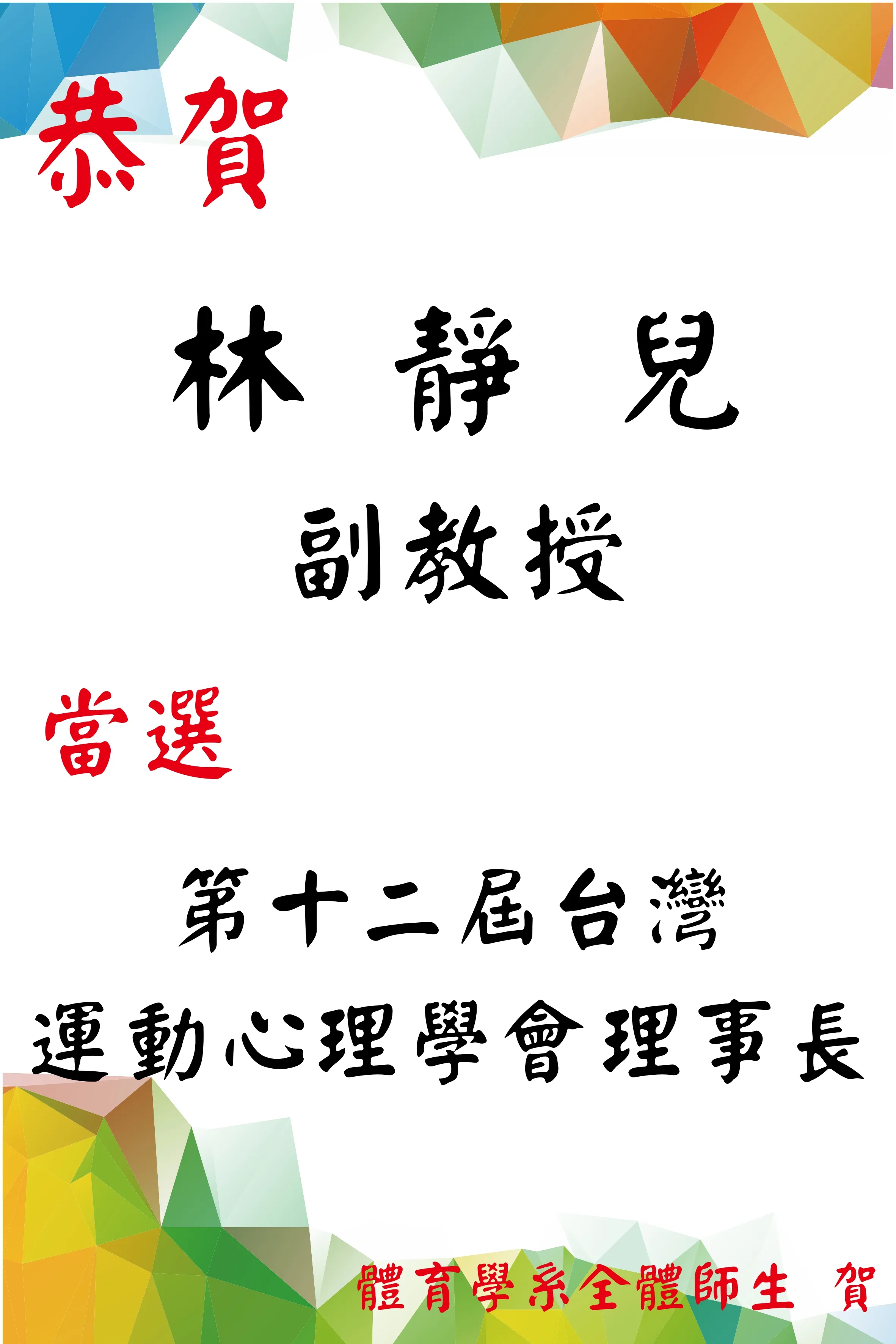 恭賀!本系林靜兒老師當選第十二屆台灣運動心理學會理事長。